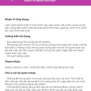 Thông số kỹ thuật của SMART TK- TẨY SẠCH CANXI VÁCH KÍNH TẮM- PPHCVM chi tiết như sau: